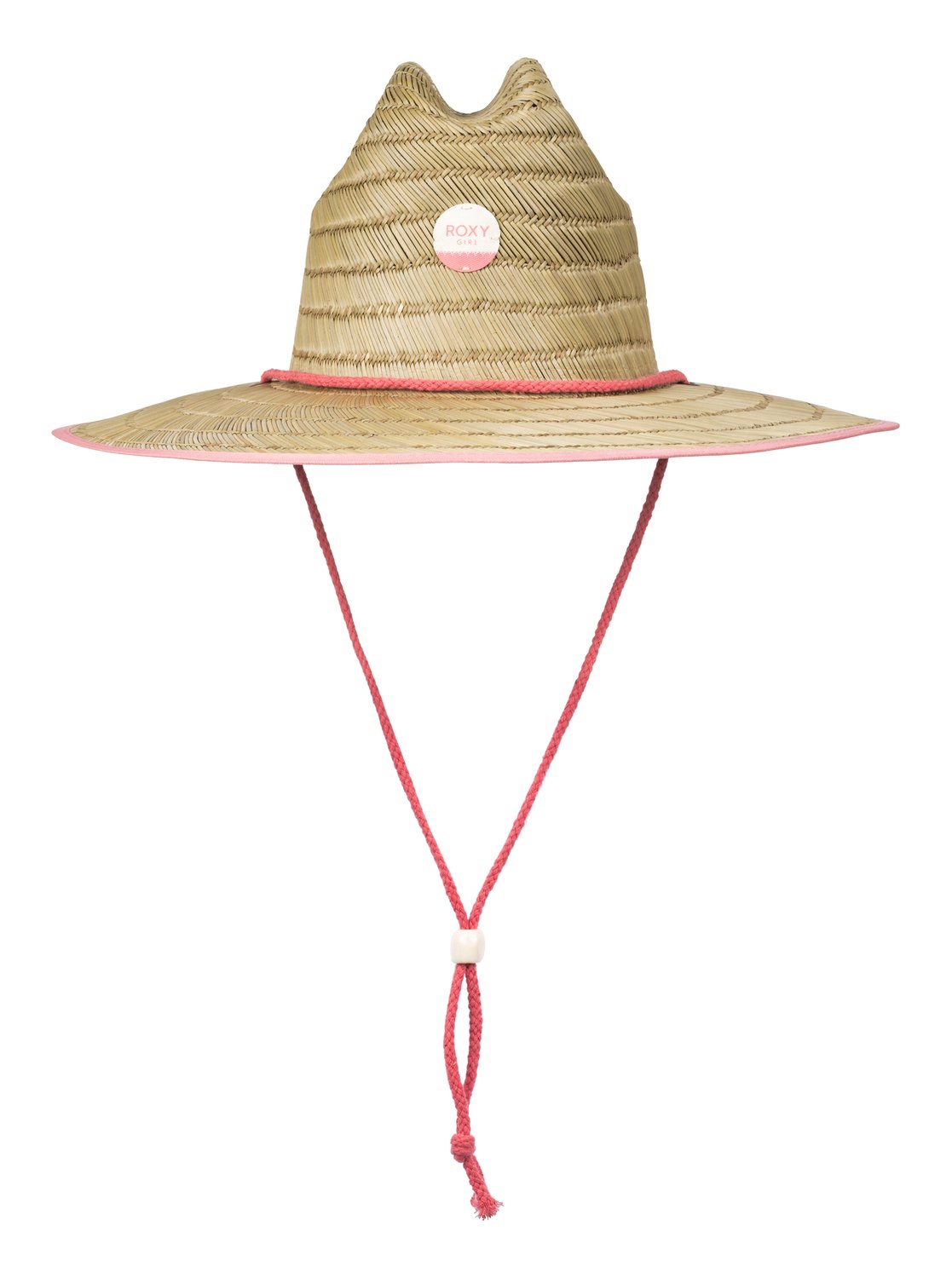 Straw sun hat with adjustable chin strap, wide brim, Roxy logo patch.